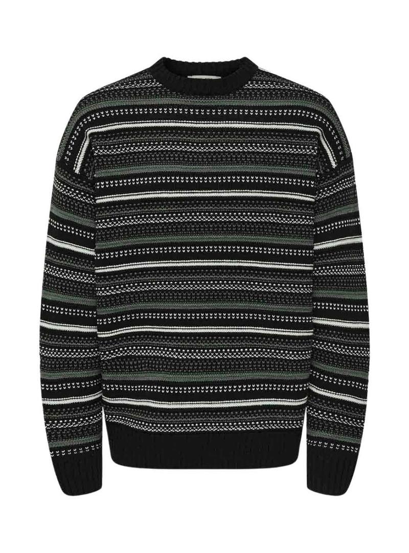 Camisola Only and Sons. Cor preta. Estampa listrada. Tecido de malha estruturada. Gola redonda. Manga comprida. Acabamentos canelados. Corte solto. Ombros caídos.