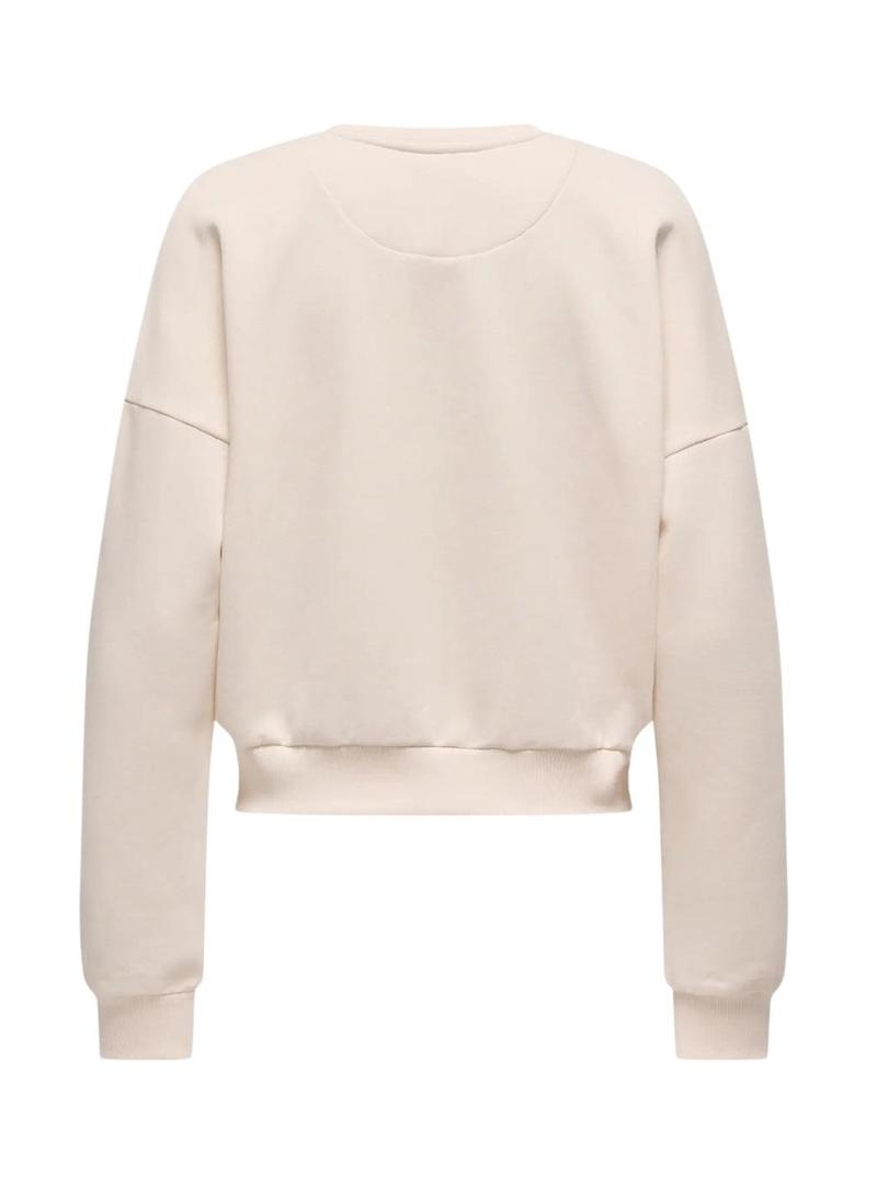 Moletom Only. Cor bege. Gola redonda. Manga comprida. Estampa dos Rolling Stones no peito. Acabamentos canelados. Ombros caídos. O modelo veste o tamanho S.