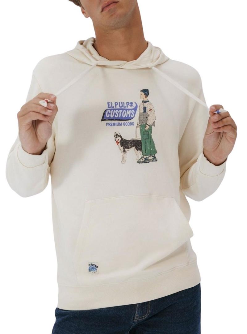 Moletom El Pulpo. Cor bege. Estampa O Polvo Customs no peito. Formato regular. Com capuz. Manga comprida. Bolso canguru. O modelo veste o tamanho L.