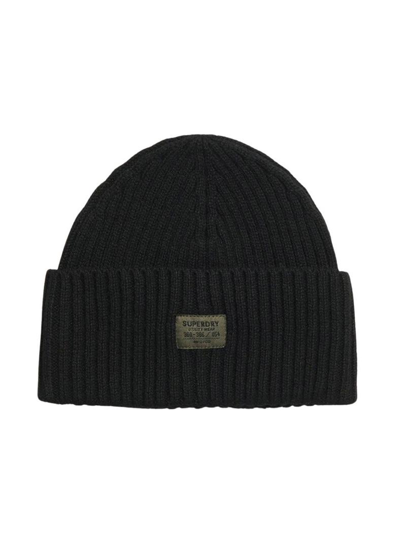 Gorro Superdry. Cor preta. Etiqueta distintiva na parte da frente. Com bainha. Tecido canelado com lã.
