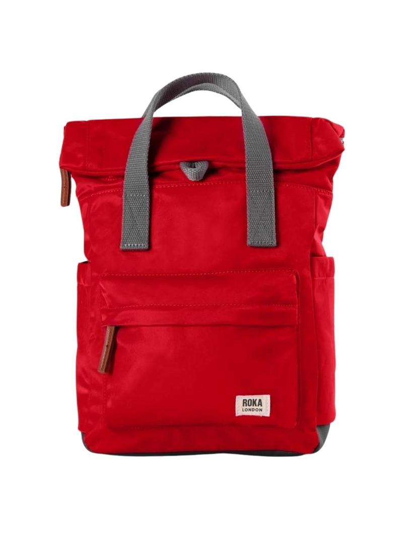 Mochila Roka. Modelo Canfield. Cor vermelha. Fecho enrolável. Tamanho pequeno. Abertura ampla. Zíper grosso. Suportes magnéticos. Puxadores de zíper em cor contrastante. Possui um bolso secreto exterior com fecho de zíper. Bolsos interiores. Material exterior: Lona reciclada resistente às intempéries. Bolsos laterais para garrafas. Alças de ombro ajustáveis, conforto V-Factor. Alças largas de algodão. Tamanho: 33 cm x 23,5 cm x 9,6 cm. Capacidade: 7 litros. Vegano. Ideal para guardar tablets ou laptops pequenos.