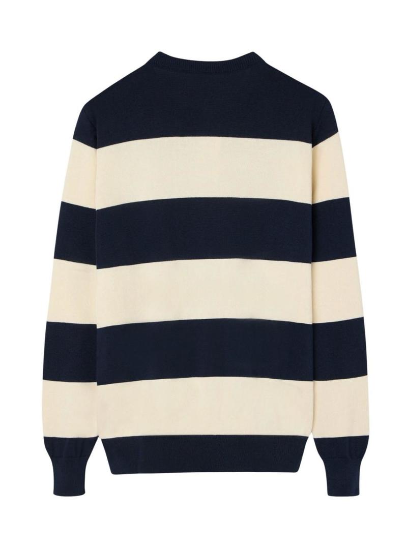Camisola Silbon. Listras largas azuis. Gola redonda. Bordado de raquetes em contraste no peito. Manga comprida. Acabamentos canelados.