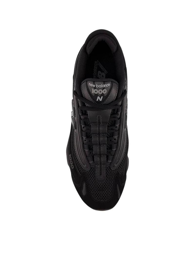 Tênis New Balance. Modelo 1000. Cor preta. Estilo técnico-retro. A entressola combinada de poliuretano e ABZORB oferece absorção de impactos através de uma mistura de amortecimento e resistência à compressão. Possui Stability Web para maior suporte no arco. Logotipo N em borracha com contorno transparente. Estrutura de cadarços externa com ilhós de nylon. Acentos refletivos e detalhes bordados. Sola com design esculpido que acentua a estética dinâmica do modelo.