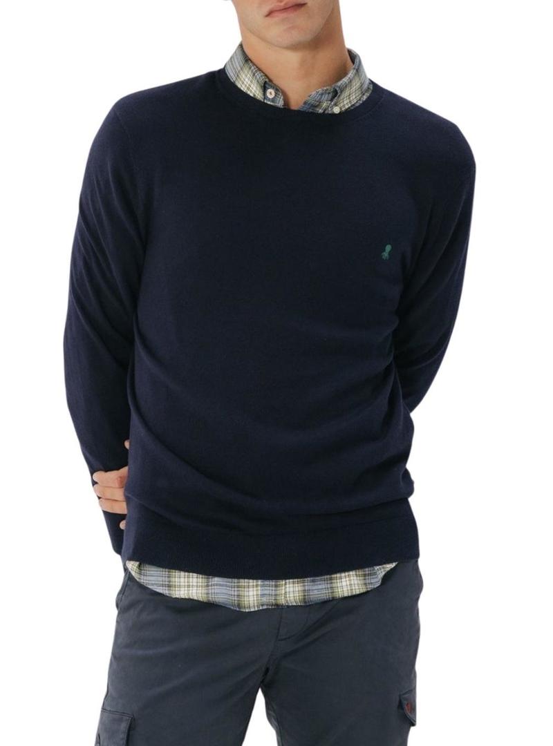 Camisola El Pulpo. Gola redonda. Cor azul marinho. Logotipo bordado no peito. Acabamentos canelados. Formato regular. Manga comprida. O modelo veste o tamanho L.