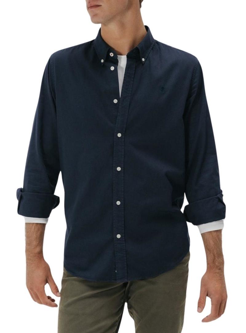 Camisa El Pulpo. Tecido de sarja tingido. Cor azul marinho. Gola com botões. Detalhe do logotipo em tom no peito. Manga comprida. O modelo veste o tamanho L.