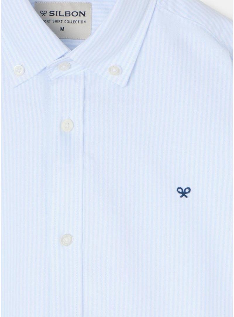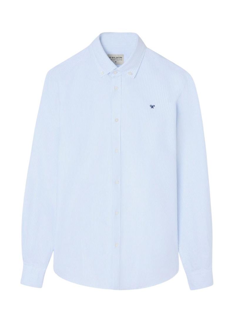 Camisa Silbon. Modelo esportivo. Tecido Oxford. Estampa de listras azuis. Corte slim. Gola com botões. Fechamento frontal com botões personalizados. Manga longa com punho e botões. Raquetes bordadas no peito. O modelo usa tamanho L.
