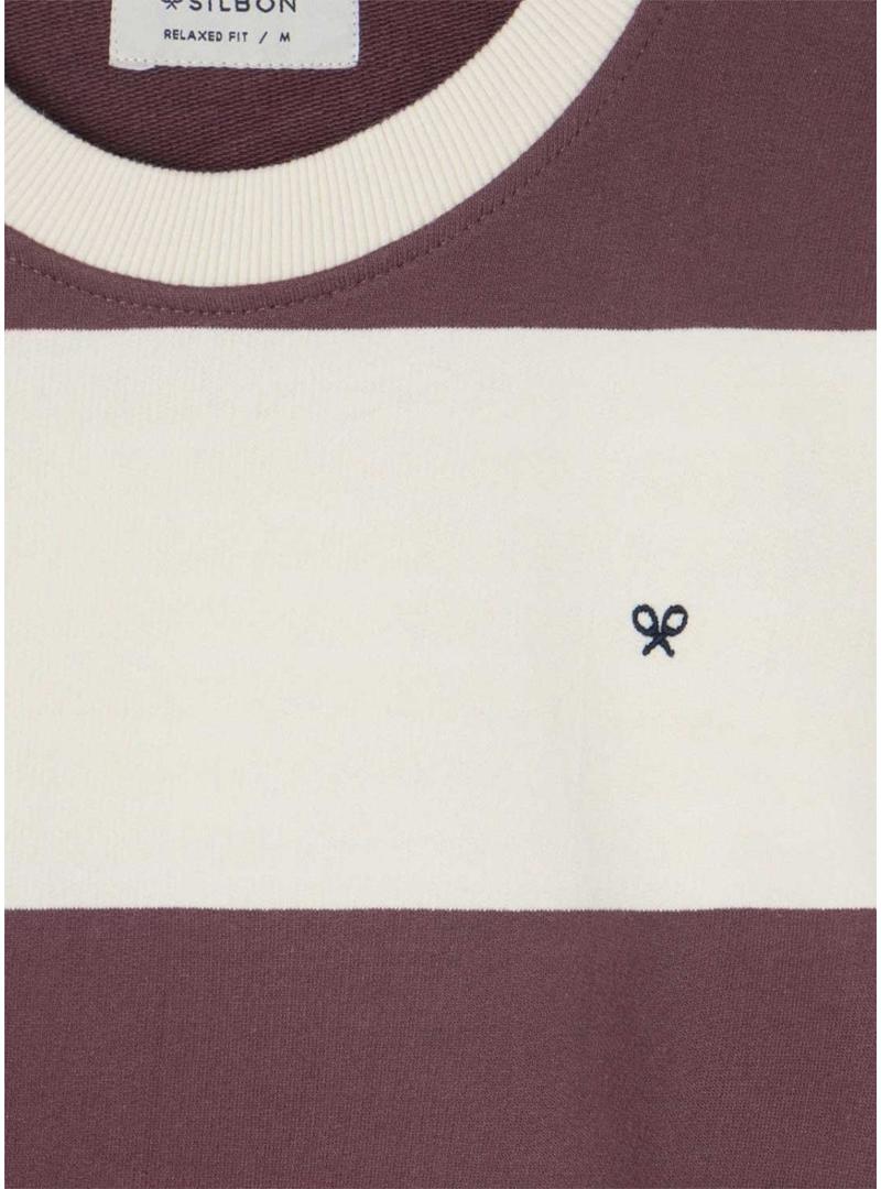 Moletom Silbon. Estampa de listras largas bordô. Formato oversized. Gola redonda. Bordado de raquetes em contraste no peito. Manga comprida. Acabamentos canelados.