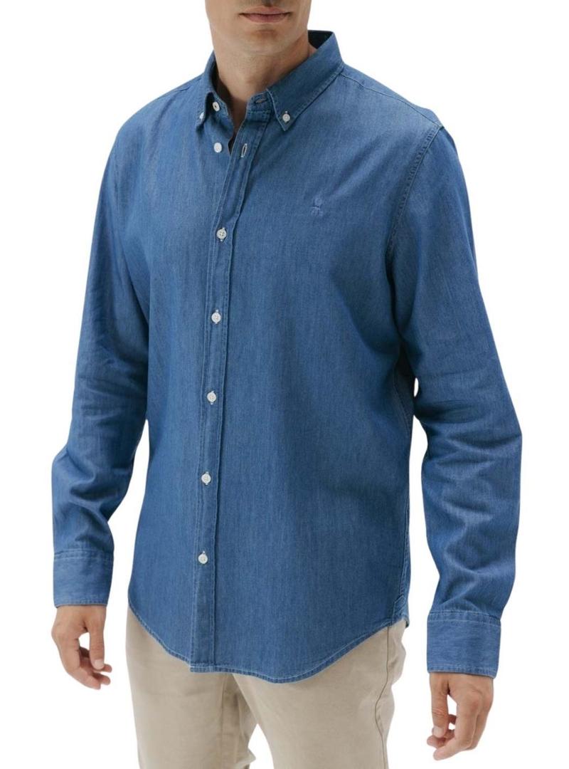 Camisa El Pulpo. Tecido denim. Cor azul médio. Gola com botões. Detalhe do logótipo a condizer no peito. Formato regular. O modelo veste o tamanho L.