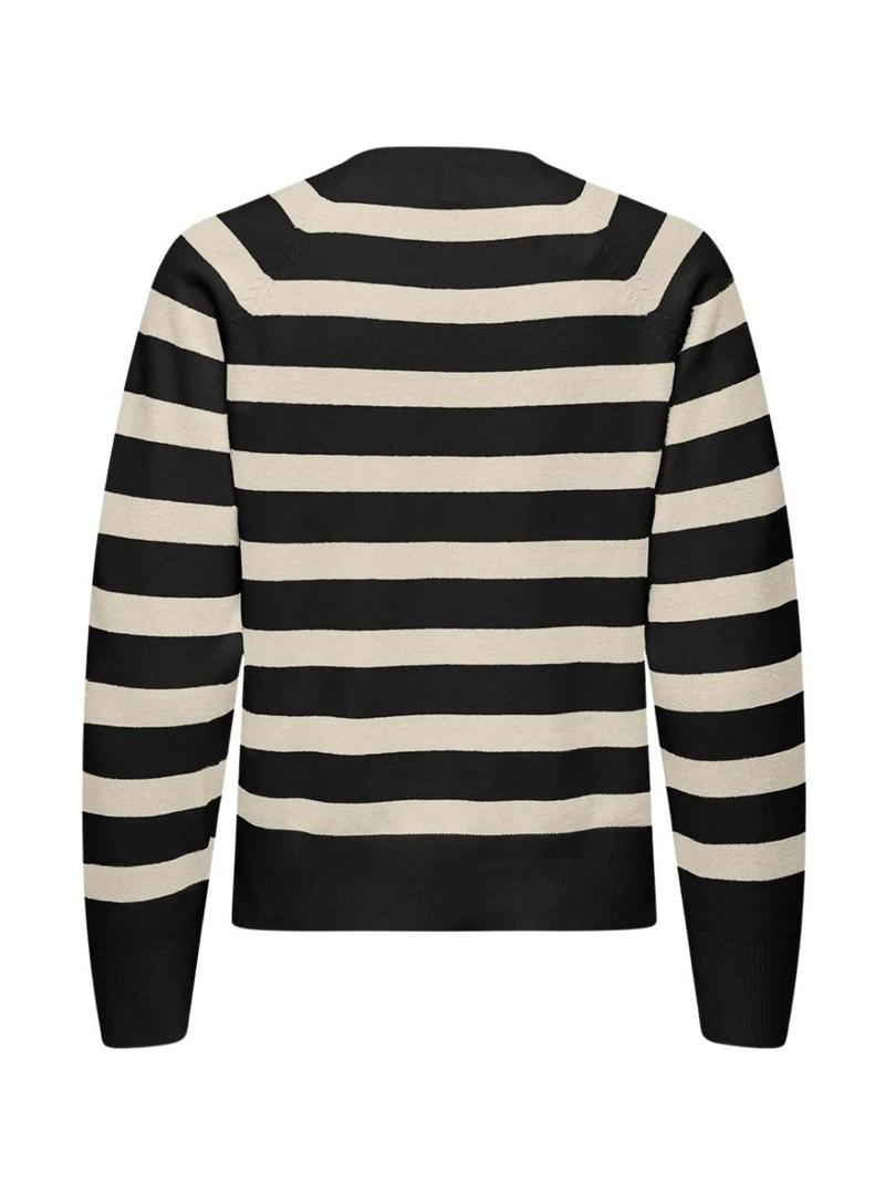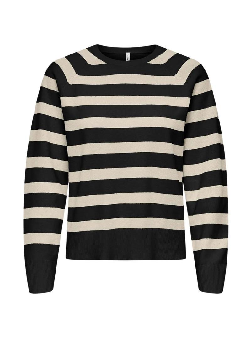 Camisola Only. Cor preta. Estampa de listras brancas. Gola redonda. Manga comprida raglã. Tecido de malha macia. Corte regular. O modelo está vestindo o tamanho S.