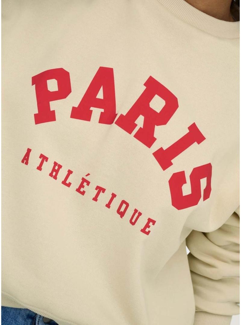 Moletom Only. Modelo Onlsweat Life. Cor bege. Gola redonda. Ombros caídos. Acabamentos canelados. Corte folgado. Gráfico Paris estampado no peito.