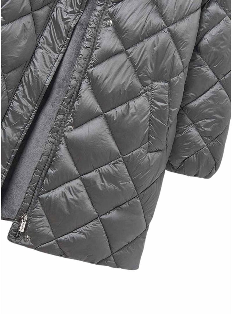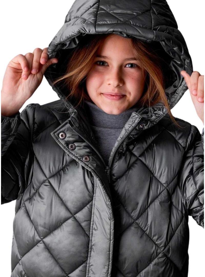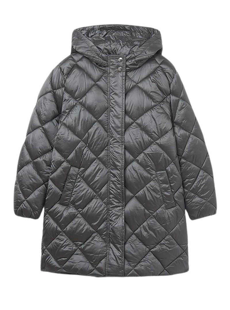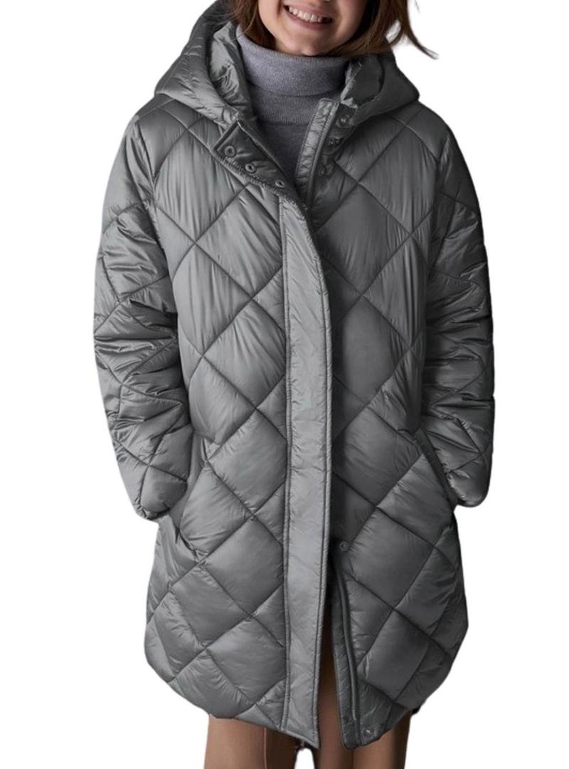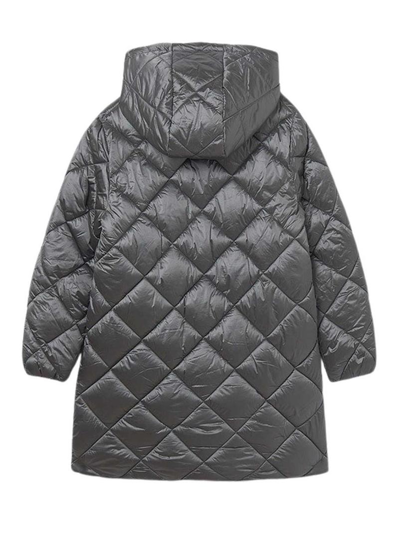 Casaco Mayoral. Modelo Carvão. Cor cinza. Tecido com acolchoado em losangos. Comprimento até os joelhos. Fecho com zíper e botões de pressão. Bolsos laterais. Com capuz.