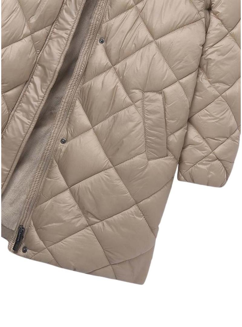 Casaco Mayoral. Modelo Carvão. Cor bege. Tecido com acolchoado em forma de diamante. Comprimento até os joelhos. Fecho com zíper e botões de pressão. Bolsos laterais. Com capuz.