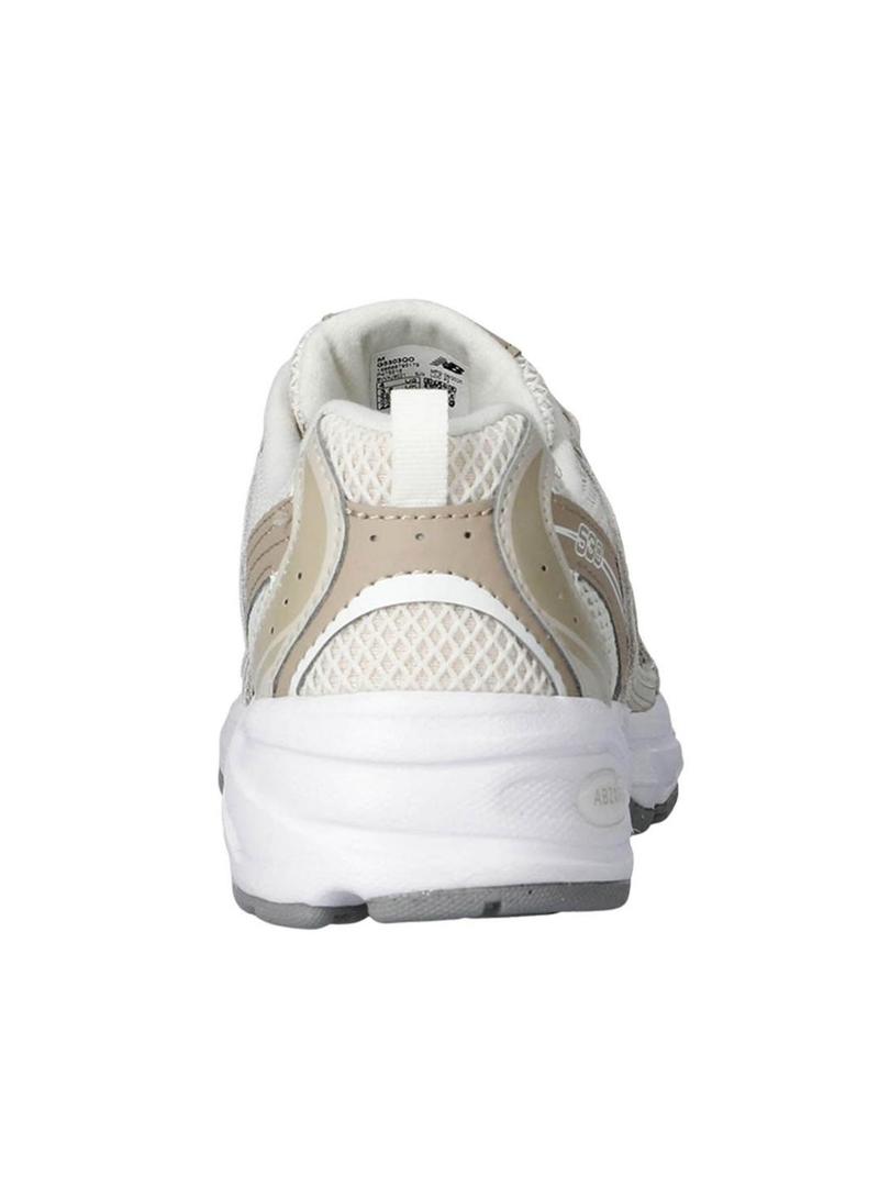 Tênis New Balance. Modelo GR530. Cor bege e branco. Detalhes em cor taupe. Parte superior combinada. Tecido, malha respirável e inserções de couro. Entressola resistente ABZORB. Fecho com cadarço. Modelo retrô. Estilo dad sneakers.