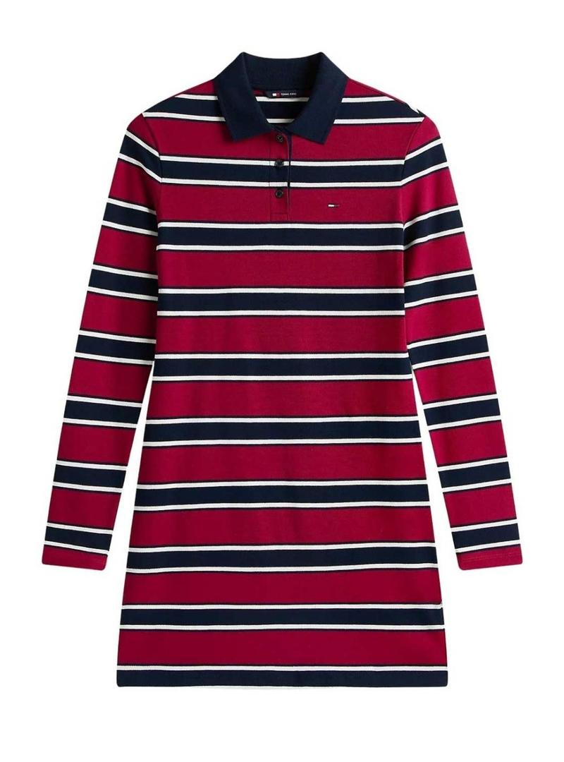 Vestido Tommy Jeans. Modelo Mini Polo. Cor granate, azul marinho e branco. Listras horizontais. Gola polo com três botões. Logo bordado no peito. Tecido levemente elástico. Corte mini. Manga longa.
