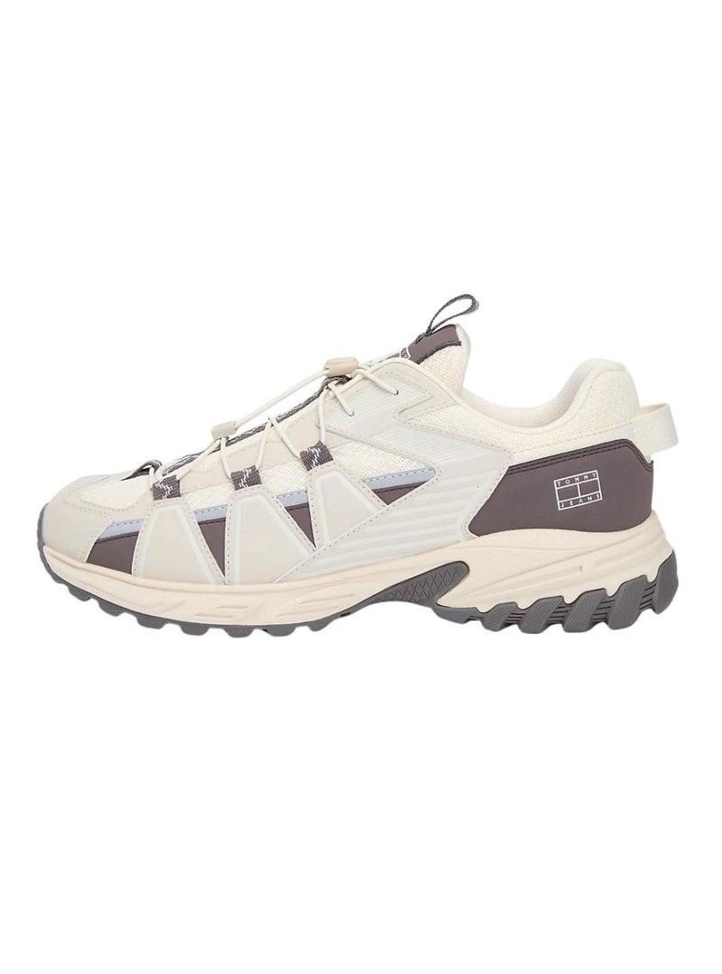 Sapatilhas Tommy Jeans. Modelo Outdoor runner. Cor bege. Detalhes em cinza. Estilo robusto. Exterior em poliuretano com forro de poliéster. Palmilha acolchoada removível de poliuretano. Sola EVA serrilhada antiderrapante com entressola 3D que proporciona estabilidade e amortecimento. Design com painéis de mistura de texturas. Alça traseira. Cordões elásticos ajustáveis com ponta. Remendo Tommy Jeans na lateral e na língua.