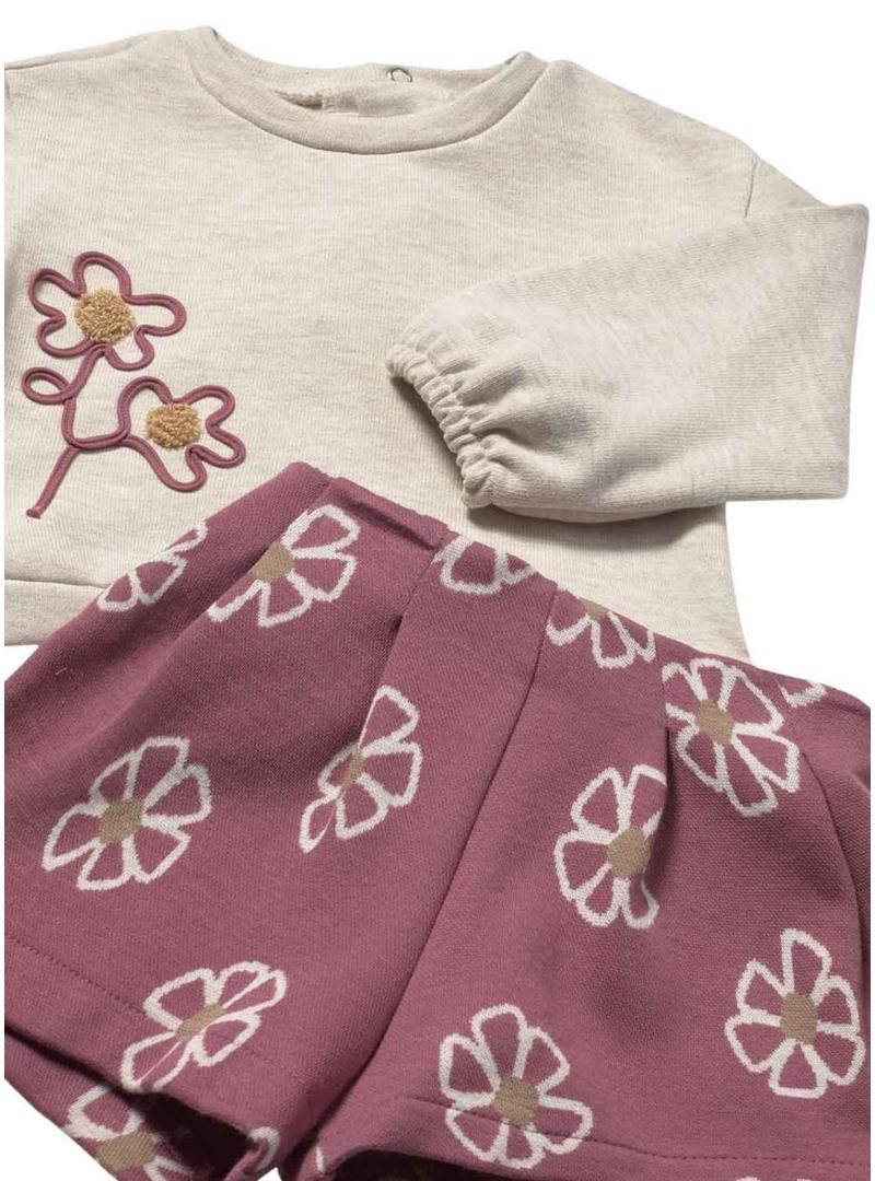 Conjunto de duas peças Mayoral. Inclui uma camisola bege e um calção rosa. Camisola com decote redondo. Fecho traseiro com botões de pressão. Tecido de malha tricotada com toque suave. Aplicações decorativas. Calção com cintura elástica. Elástico ajustável com botões no interior da cintura. Motivos florais.