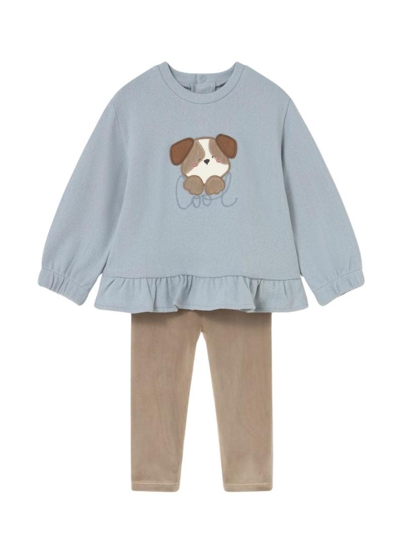 Conjunto de moleton e legging Mayoral cachorro azul e camelo para bebê.