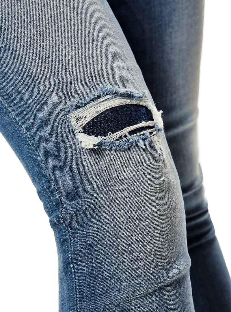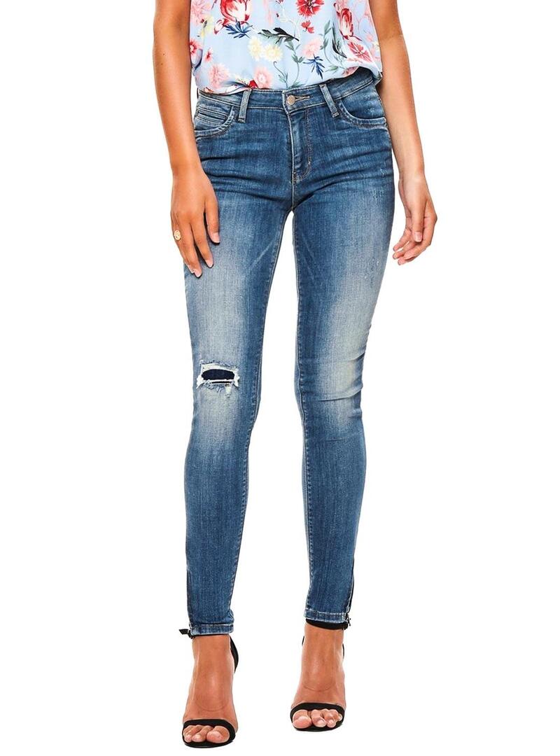 Jeans Only. Modelo Kendell. Lavagem média. Cinta no tornozelo Fecho na bainha. Detalhe quebrado. 5 bolsos Fecho con zíper e botão. Coloque o Skinny. Cintura média O modelo está usando tamanho 28.