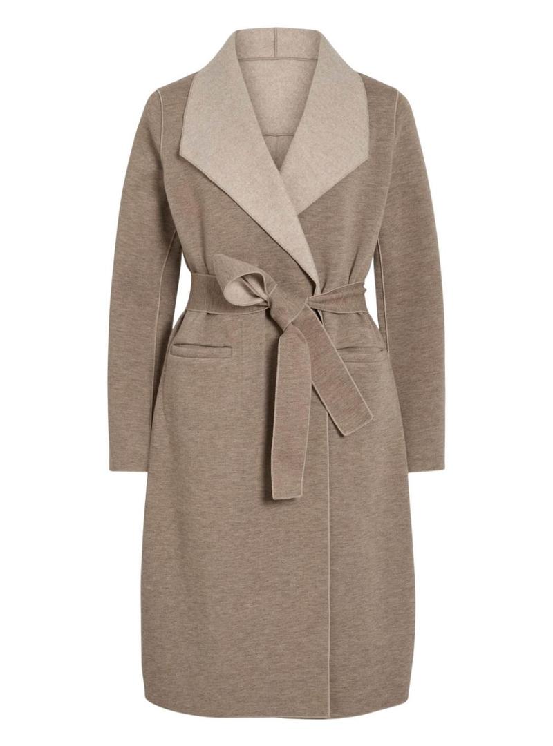 Casaco Vila. Modelo Juice. Cor bege. Fechamento cruzado sem botões. Cinto auto amarrado. Bolsos laterais. Tecido suave e compacto.