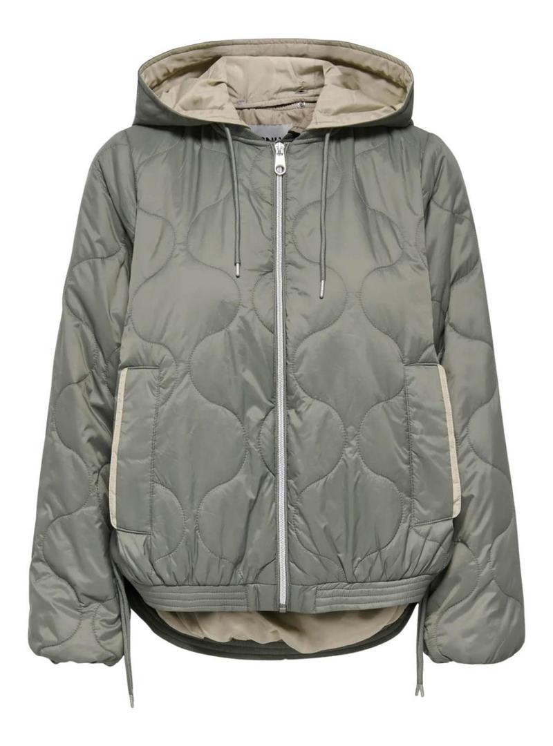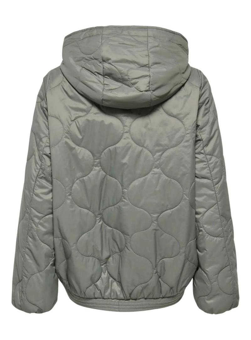 Casaco Only. Modelo Miki. Cor verde. Tecido acolchoado geométrico. Ajuste folgado. Fecho com zíper. Capuz com cordão ajustável. Bolsos laterais. Extremidades elásticas. Ajuste folgado. Corte estilo capa. Parte traseira mais longa que a frente.