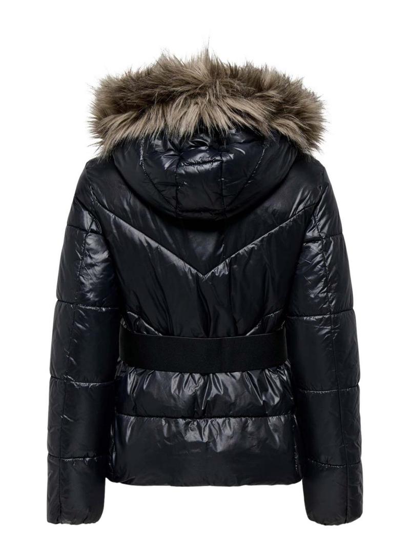 Casaco Only. Modelo Fever. Tecido acolchoado. Cor preta. Fechamento com zíper. Gola alta. Capuz com pelo removível. Bolsos laterais com zíper. Efeito brilhante. Ajuste regular.