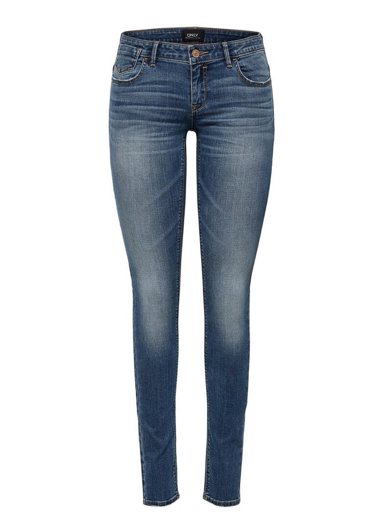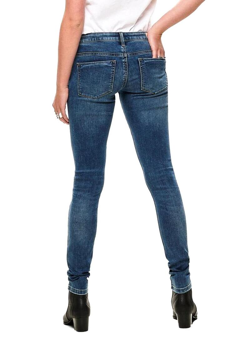 Jeans Only. Modelo Coral. Lavagem escura. macio desgastado. Coloque o skinny. 5 bolsos Fecho con zíper e botão. Cintura baixa. O modelo está usando tamanho 27.