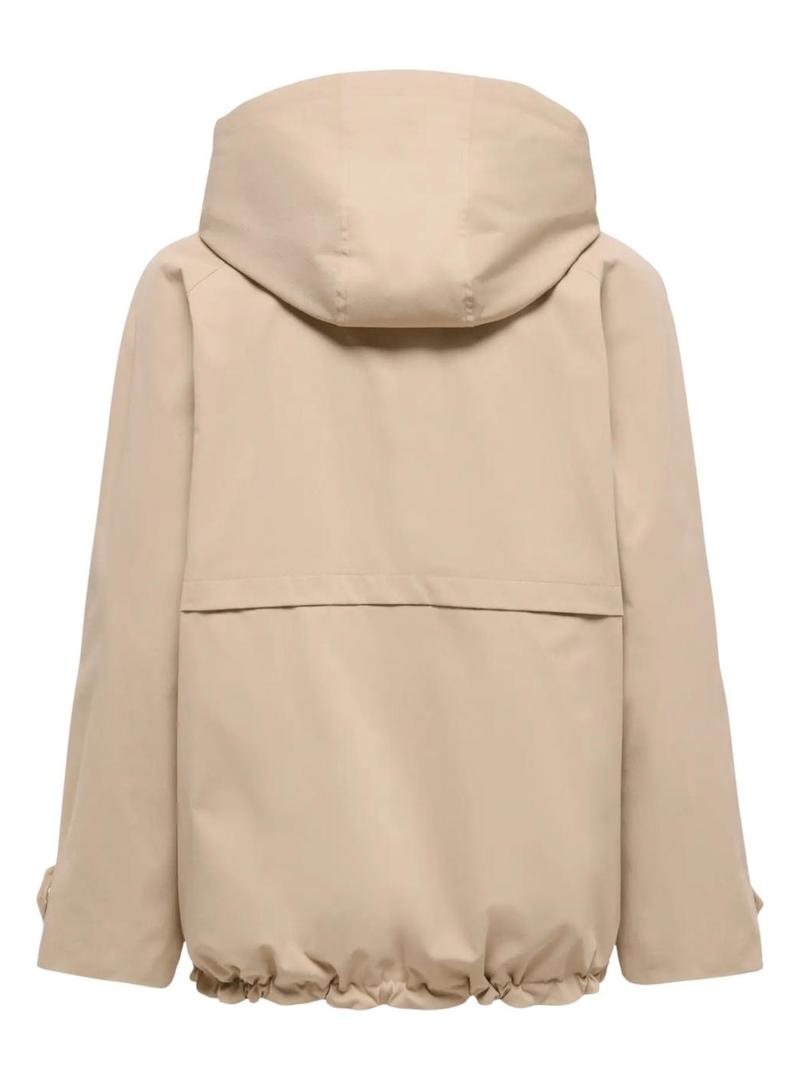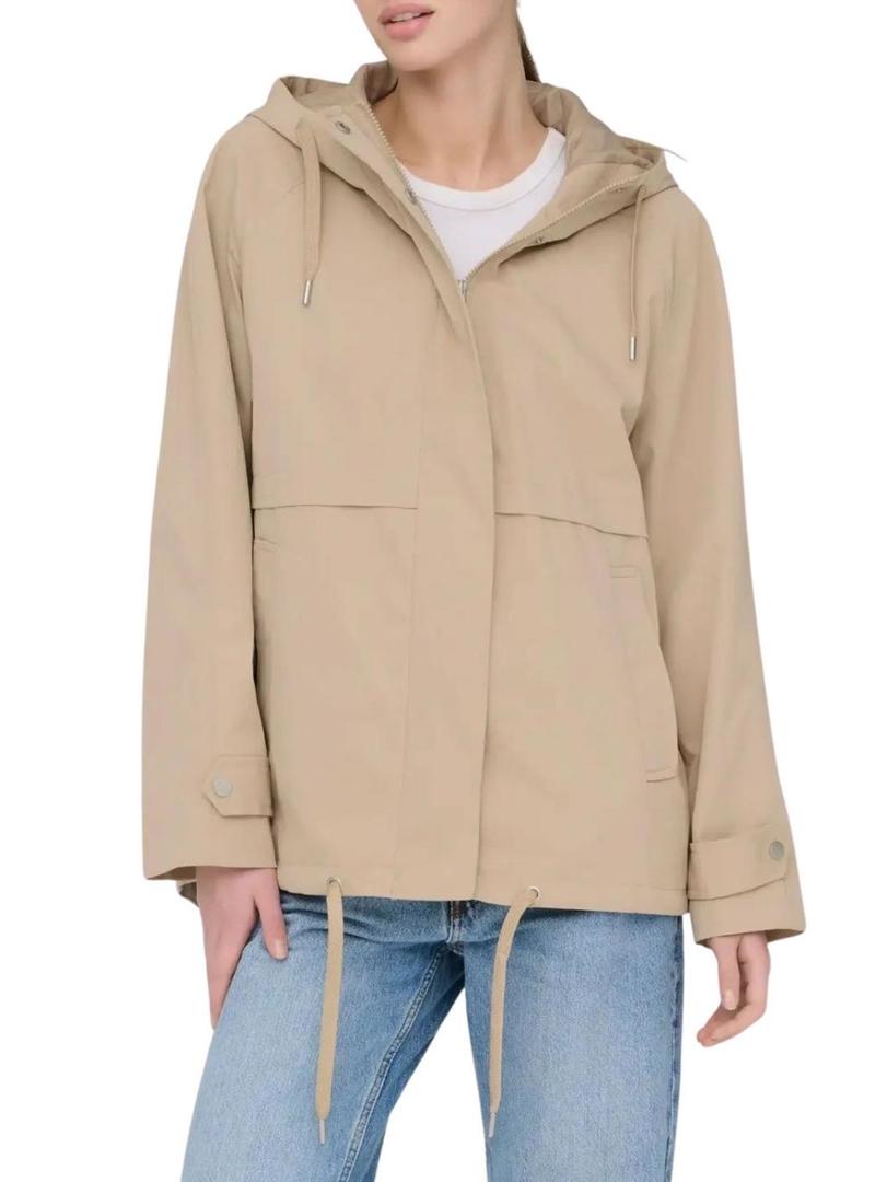 Parka Only. Modelo Orquídea. Cor bege. Fecho de correr oculto. Gola alta. Capuz com cordão ajustável. Bolsos laterais. Costura central. Bainha ajustável com cordão.