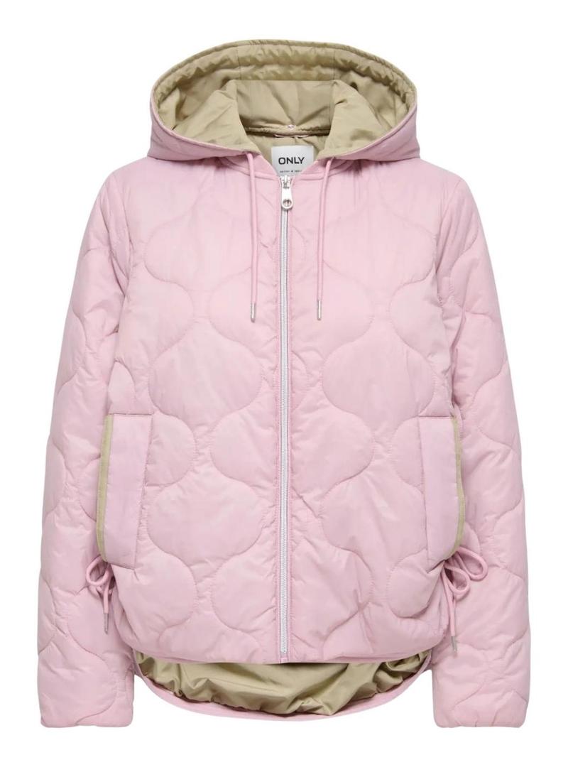 Casaco Only. Modelo Miki. Cor rosa com forro bege. Tecido acolchoado geométrico. Ajuste folgado. Fecho com zíper. Capuz com cordão ajustável. Bolsos laterais. Extremidades elásticas. Ajuste folgado. Corte estilo capa. Parte de trás mais comprida que a parte da frente.