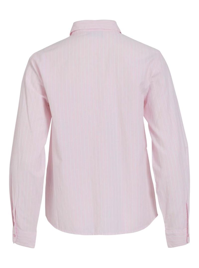 Camisa Vila. Modelo Darma. Cor rosa. Tecido com listras verticais em branco. Gola regular. Ajuste reto. Fechamento com botões.