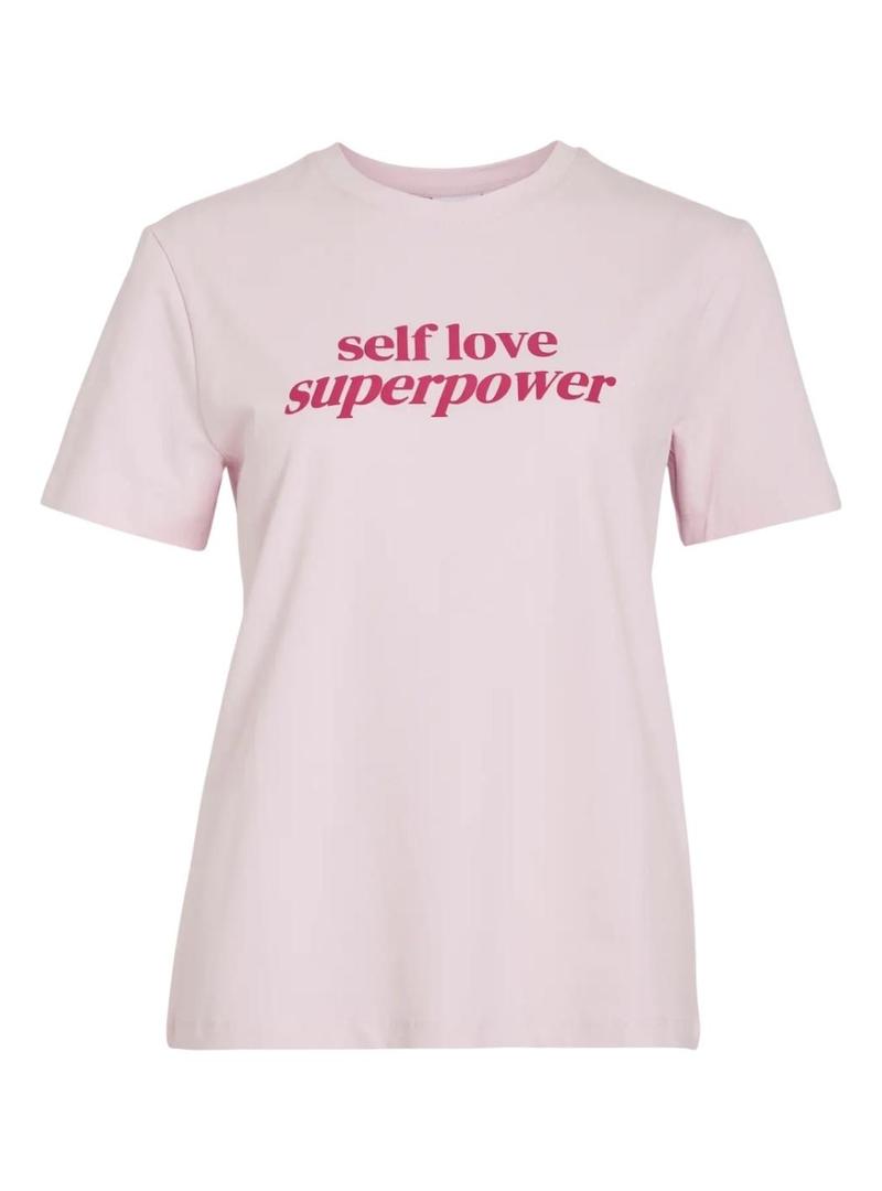 Camiseta Vila. Modelo Vinora. Cor rosa. Gola redonda. Manga curta. Ajuste reto. Mensagem estampada no peito: Self love superpower.