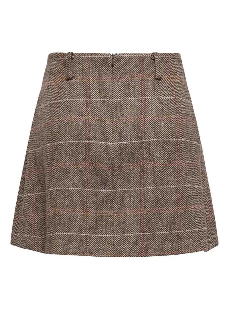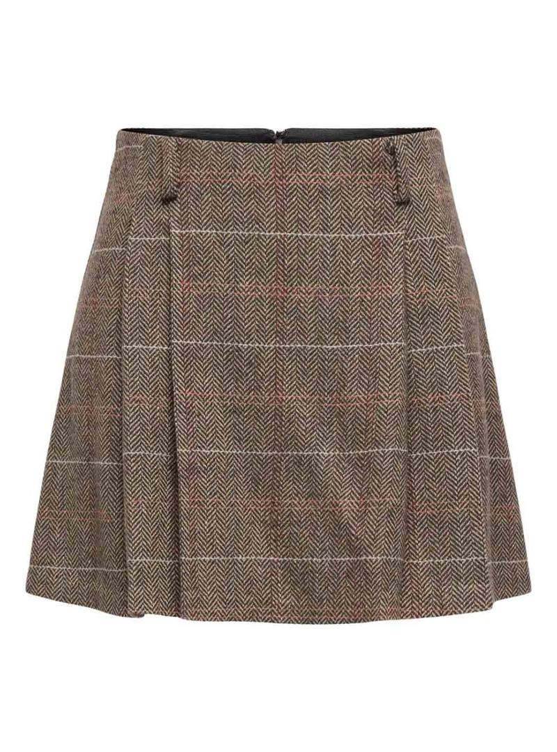 Saia Only. Modelo Ricca. Cor marrom. Estampa geométrica. Fecho com zíper na parte de trás. Corte plissado. Comprimento mini. Tecido de lã.