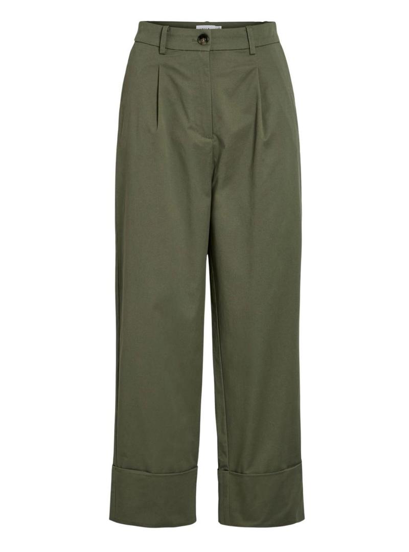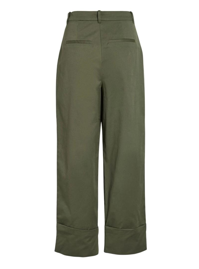 Calça Vila. Modelo Simone. Cor verde. Cintura alta. Fechamento com botão e zíper. Barra dobrada. Corte coulotte. Comprimento acima do tornozelo. Bolsos laterais. Pregas frontais.