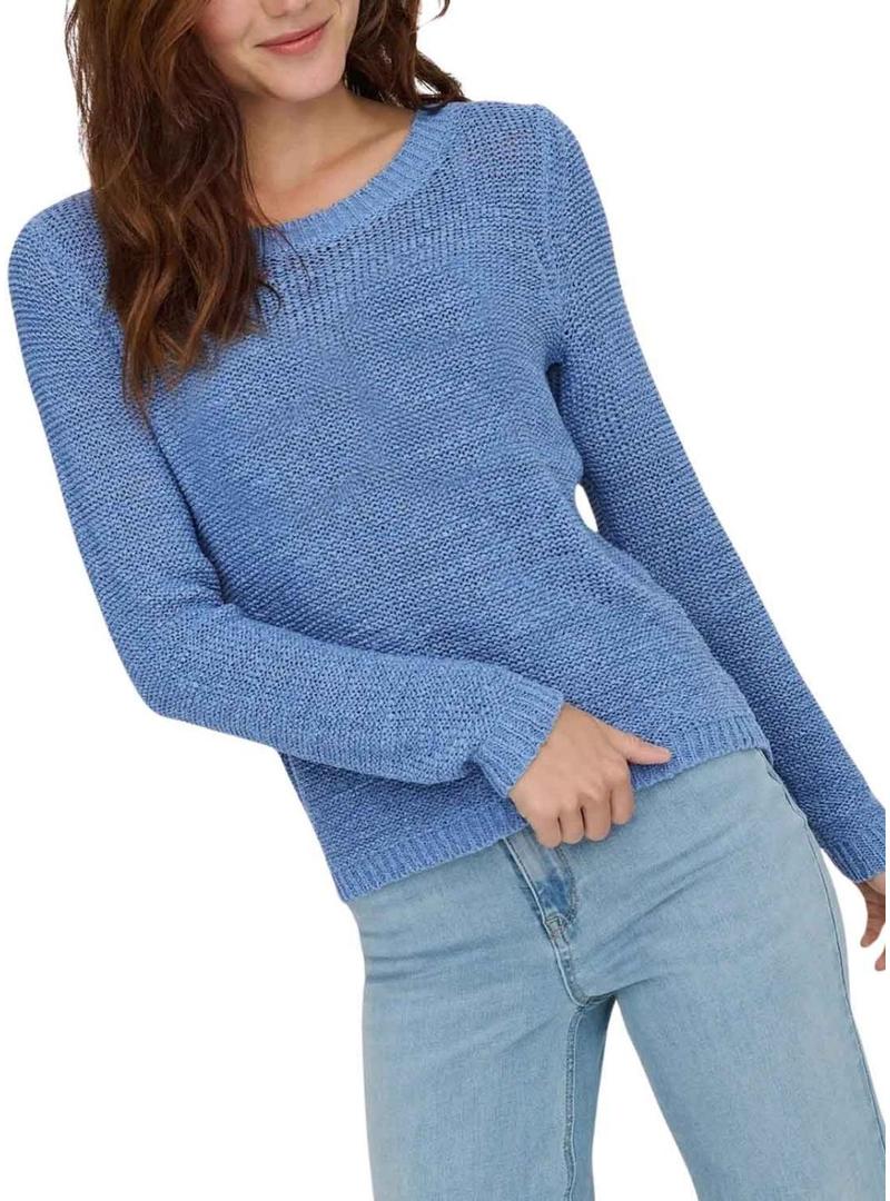Camisola Only. Modelo Geena. Cor azul. Decote redondo amplo. Manga comprida. Extremidades caneladas. Ajuste regular. Tecido de malha plana.