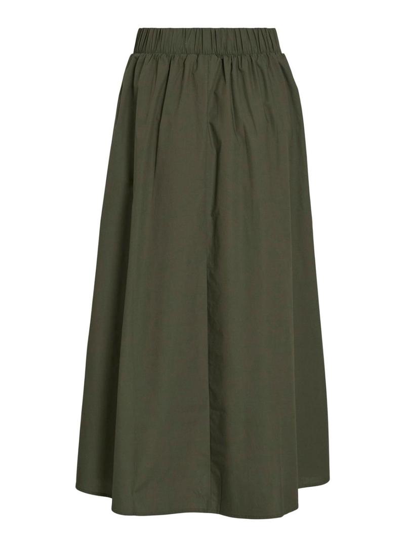 Saia Vila. Modelo Visophie. Cor verde. Cintura alta. Bolsos laterais. Comprimento midi. Cintura elástica. Corte com volume.