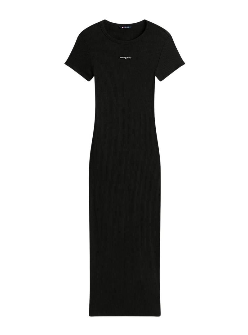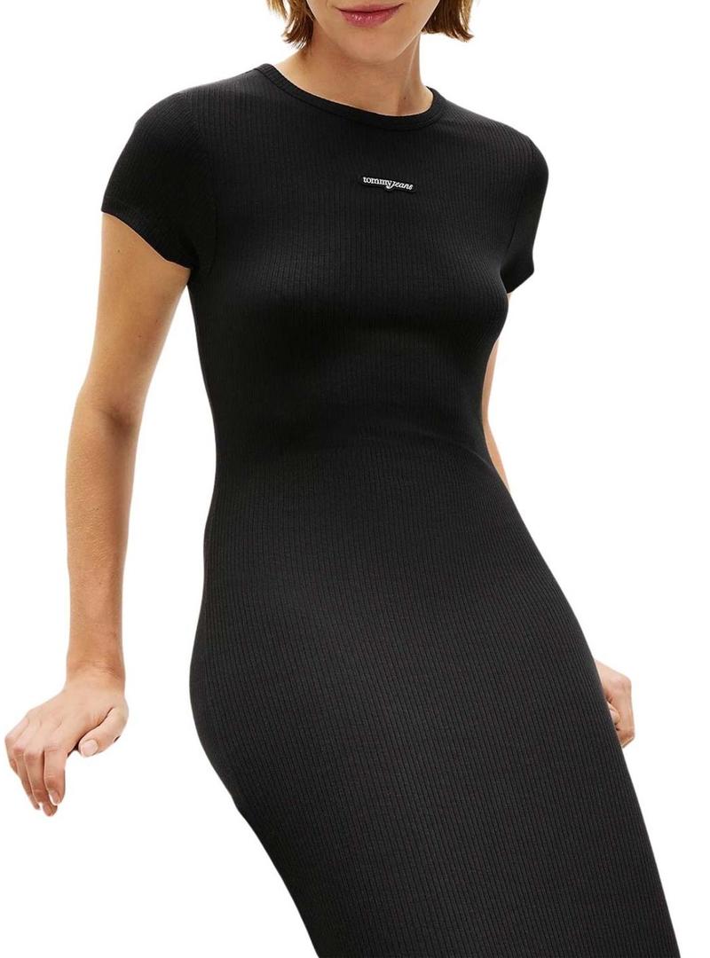 Vestido Tommy Jeans. Modelo Script. Cor preta. Gola redonda. Manga curta. Tecido canelado. Corte ajustado. Elástico. Comprimento midi. Marca bordada no peito.