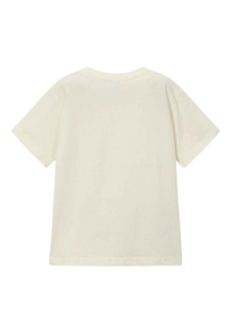 Camiseta Mayoral. Modelo Robot. Cor bege. Gola redonda. Manga curta. Ajuste regular. Ilustração estampada na frente.