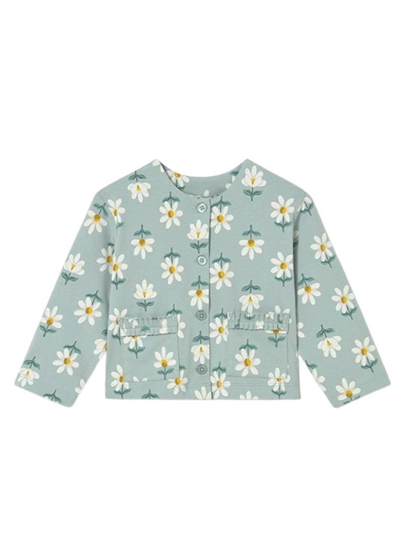 Conjunto Mayoral. Três peças. Camiseta com ilustração estampada. Manga curta. Gola redonda. Fechamento traseiro. Jaqueta com fechamento de botões de pressão. Gola redonda. Manga comprida. Cor azul. Estampado com flores. Legging em azul com cintura elástica.