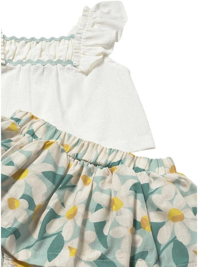 Conjunto Mayoral. Blusa branca. Fechamento com botões atrás. Gola quadrada. Mangas com babados. Detalhes em azul. Saia com cobertura de fralda. Tecido estampado com flores.