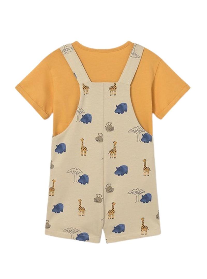 Conjunto de Mayoral. Camiseta em laranja com botões frontais. Manga curta. Gola redonda. Macacão curto com alças de botão. Bolsos laterais. Cor bege com estampa de safári.