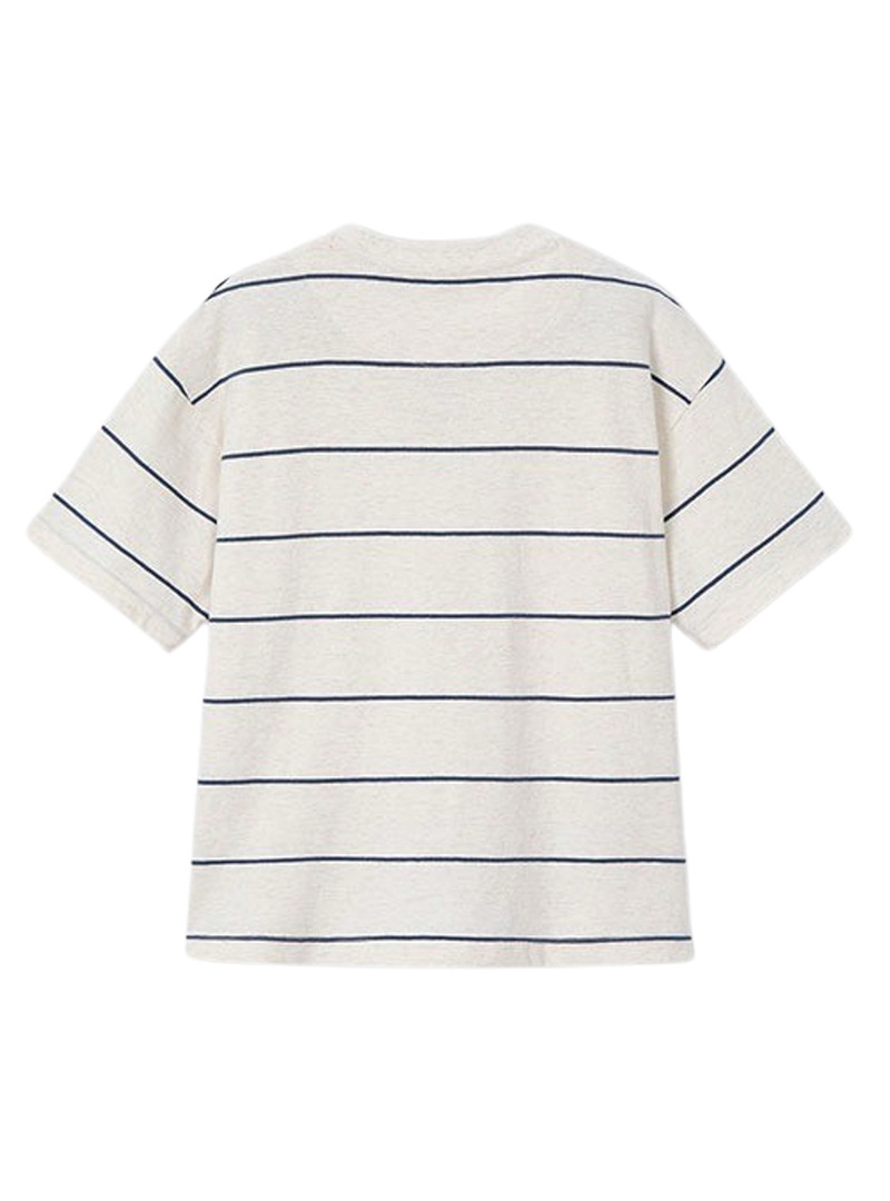 Camiseta Mayoral. Estampa listrada. Cor branca e listras em azul. Folha bordada no peito em fio coral. Gola redonda. Manga curta. Ajuste regular.