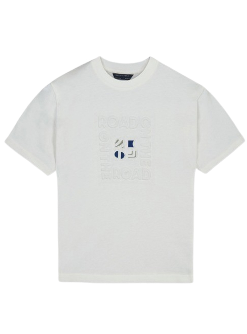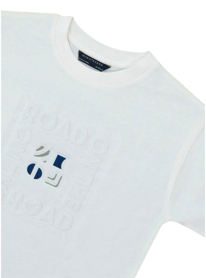 Camiseta Mayoral. Modelo Embossed. Cor branca. Gola redonda. Mensagem 'On the road' em relevo. Manga curta. Ajuste regular.