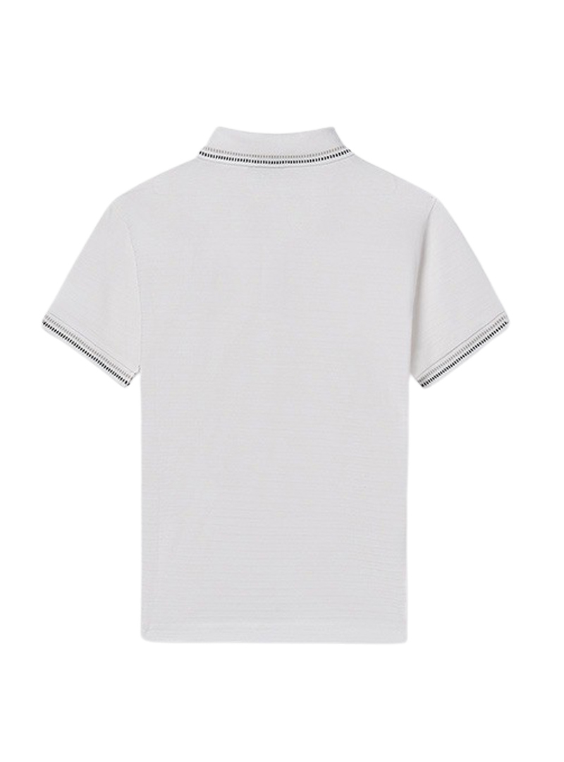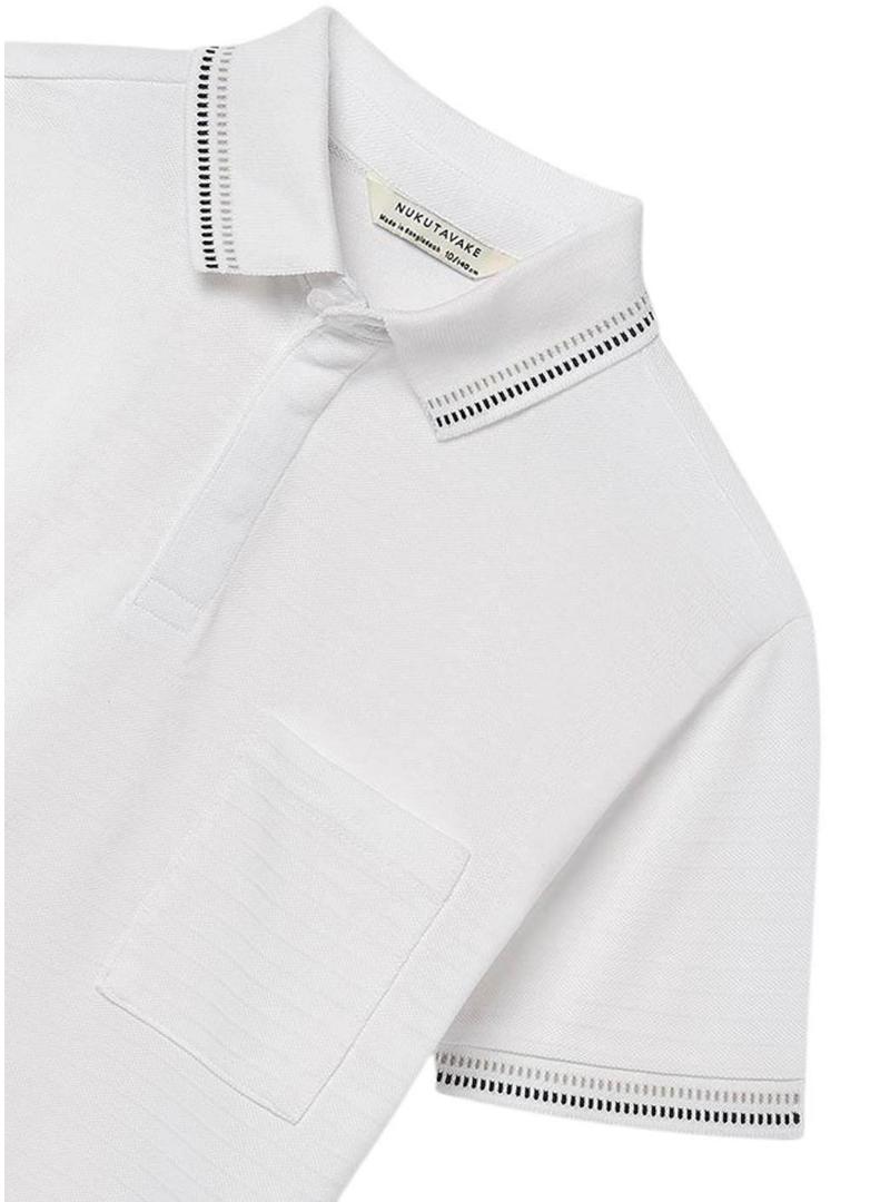 Camisa do prefeito. Cor branca. Listras azuis e cinzas no pescoço e nas extremidades das mangas. Gola com botões ocultos. Manga curta. Bolso no peito. Ajuste regular.