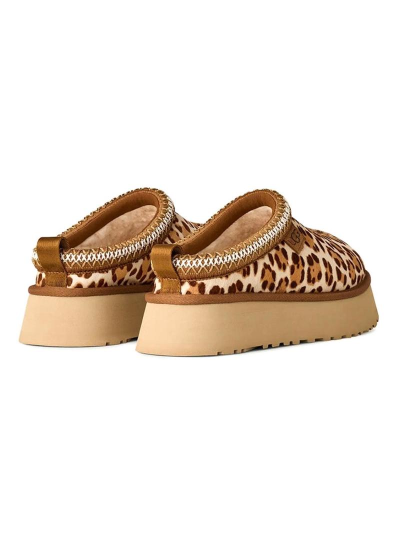Tamancos UGG. Modelo Tazz Leopard. Cor bege com estampa de leopardo. Sem calcanhar. Cabedal de camurça macia. Detalhe trançado UGGbraid de poliéster reciclado. Forro e palmilha de pele de ovelha. Quentes e leves. Sola de EVA. Plataforma de 4,4 cm. Acabamento étnico em poliéster. Logotipo UGG gravado.