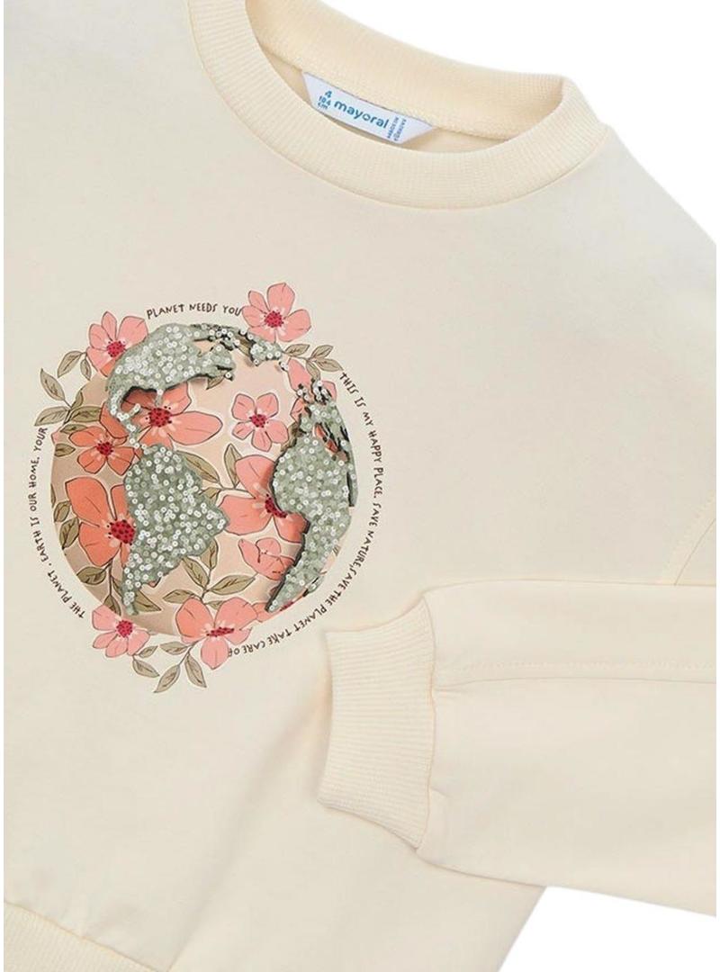 Moletom Mayoral. Modelo Planeta. Cor bege. Gola redonda. Manga comprida. Extremidades caneladas. Ajuste folgado. Ilustração do planeta terra com estampa floral em cor-de-rosa. Detalhes em relevo com lantejoulas.