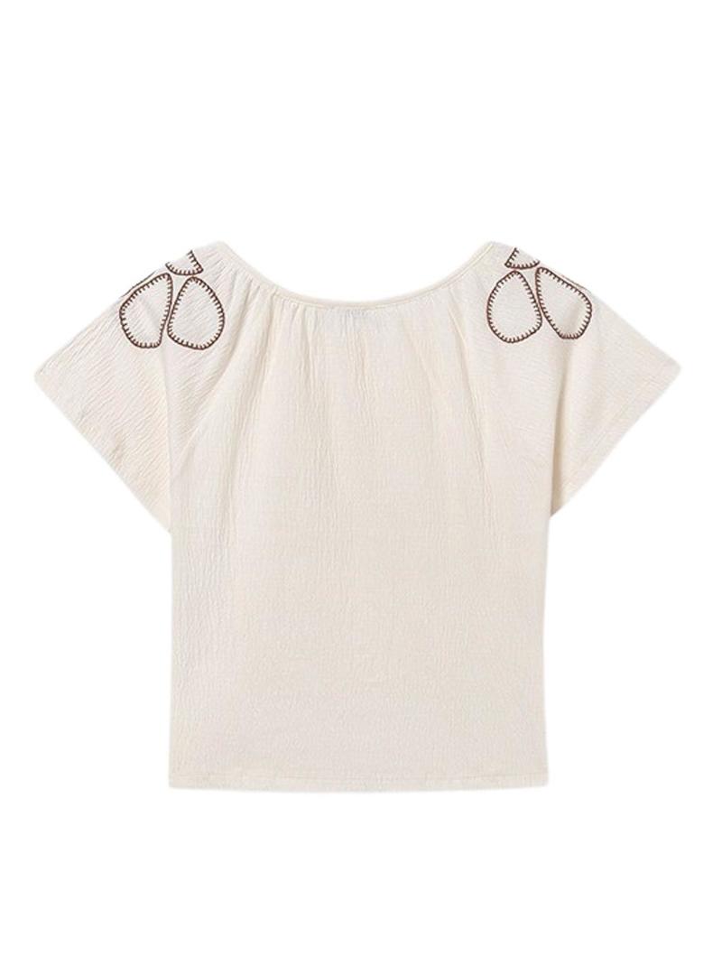 Camiseta Mayoral. Cor bege. Tecido de bambula. Decote redondo. Manga curta raglã. Detalhes bordados nos ombros. Ajuste leve.