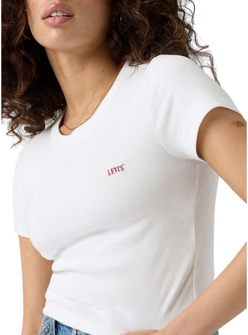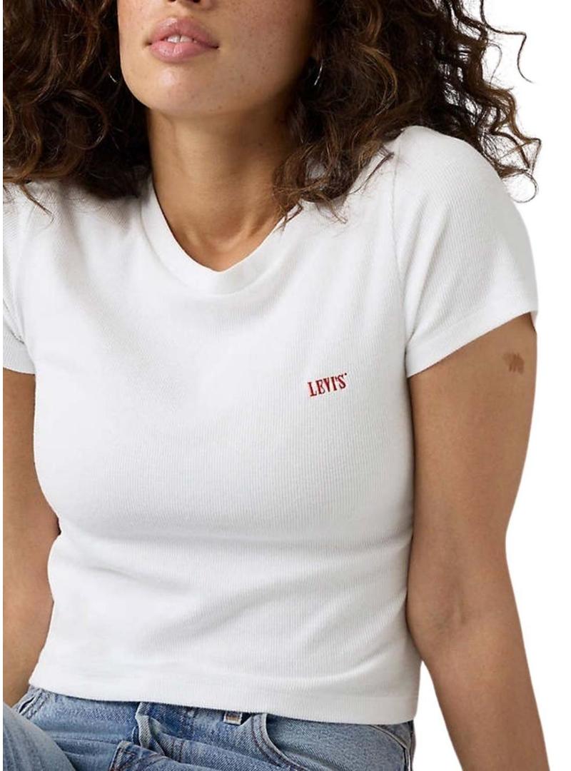 Camiseta Levis. Modelo Sporty. Cor branca. Tecido canelado. Corte justo. Manga curta. Gola redonda. Logotipo bordado no peito em vermelho.