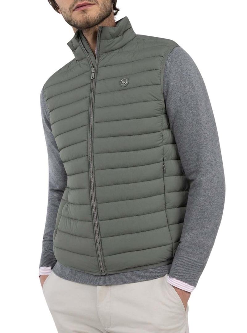 Colete acolchoado El Ganso. Modelo básico. Cor verde. Gola alta. Fecho com zíper. Logo circular no peito. Tecido acolchoado leve resistente à água. Bolsos laterais. Axila elástica.