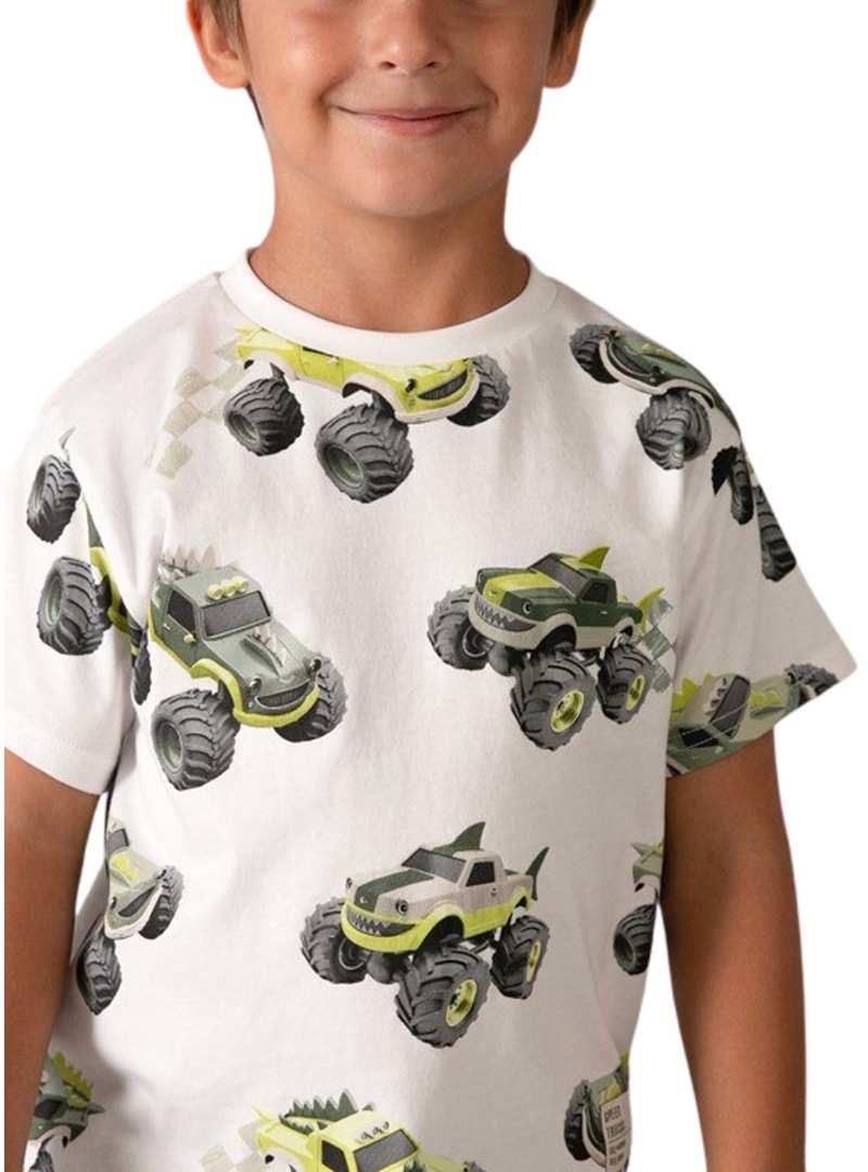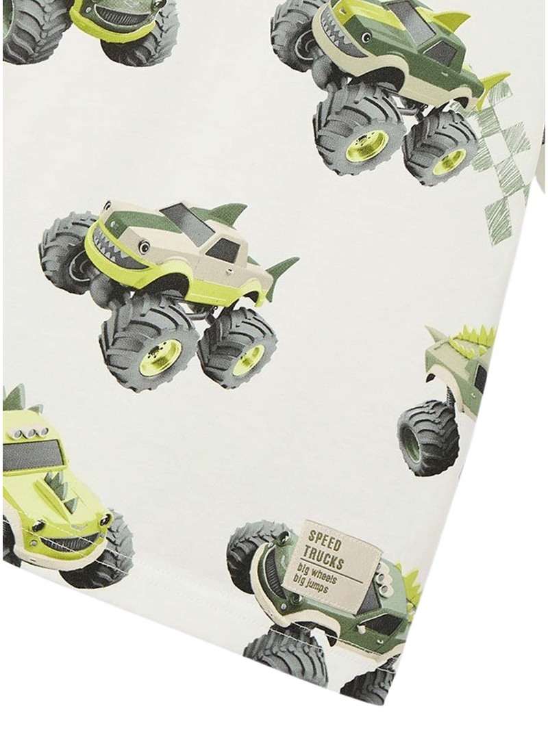 Camiseta Mayoral. Gola redonda. Manga curta. Estampado de carros por todo o tecido. Gola canelada. Feito em algodão Better Cotton.