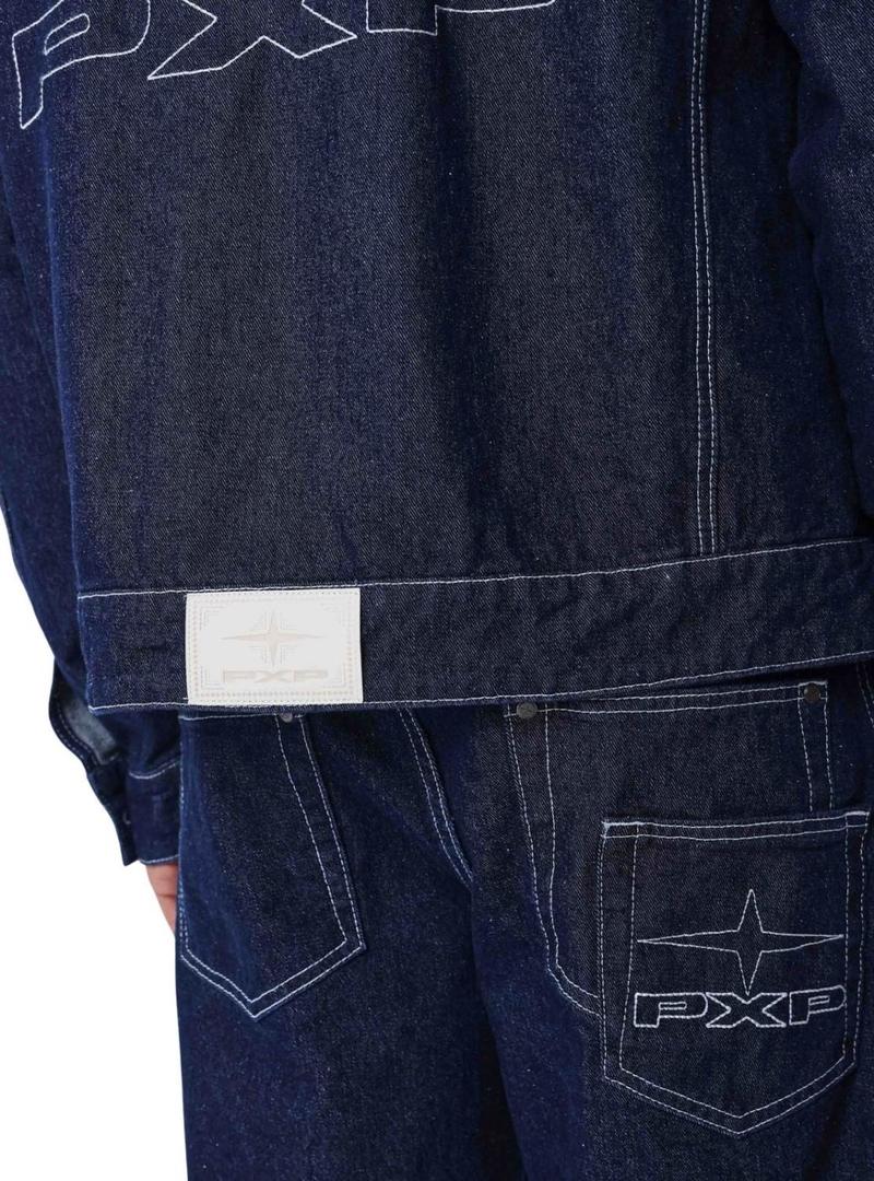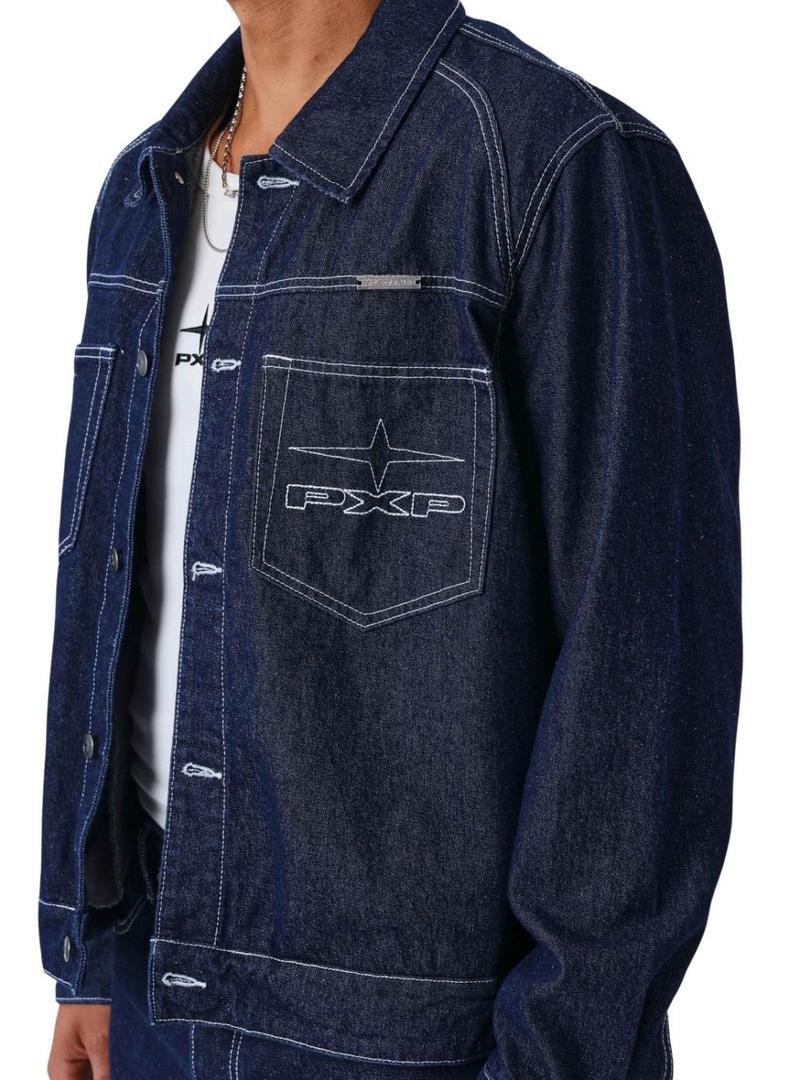 Jaqueta jeans Project x Paris. Jeans cru. Fechamento com botões. Costuras em contraste. Corte reto. Patch da marca na parte de trás. Logo bordado. Bolsos laterais.