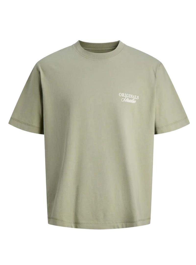 Camiseta Jack and Jones. Modelo Norrebro. Cor verde salva. Gola redonda. Manga curta. Ajuste folgado. Mensagem estampada no peito e nas costas com estilo vintage. Etiqueta da marca na lateral.